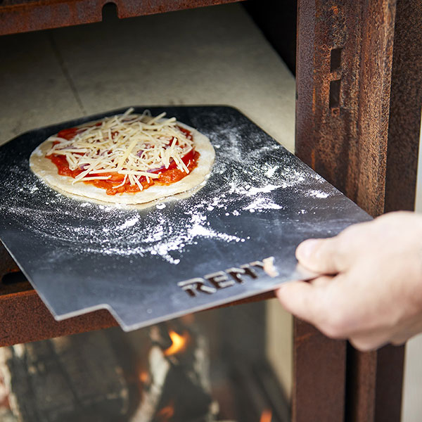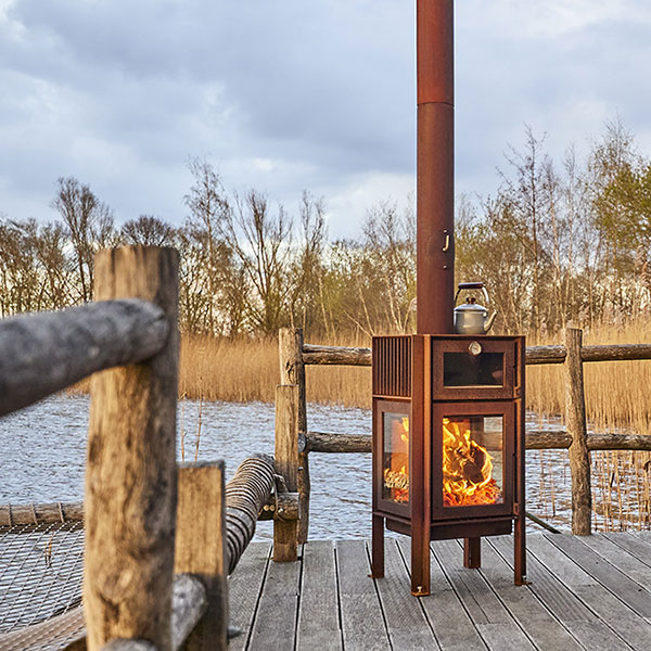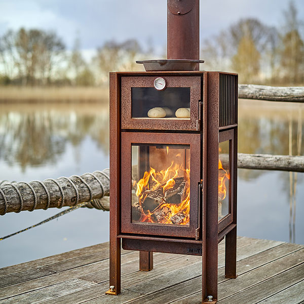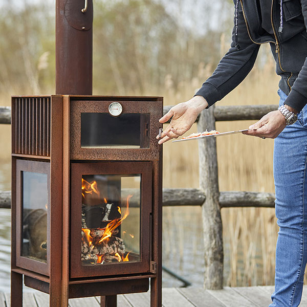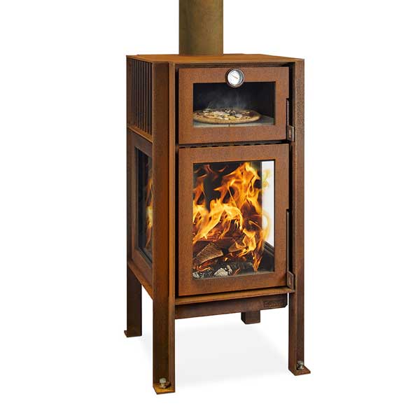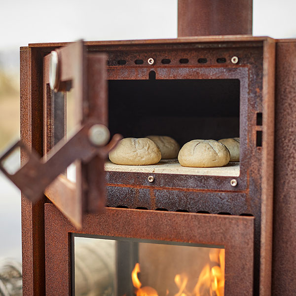 The oven has a pizza stone to prepare delicious pizzas, bread, and other oven dishes.The top plate gets very hot, so you can also use it to heat up certain things. The legs of the Quercus are fitted with stainless steel bolts allowing the fireplace to stand free from the ground to avoid rust stains.